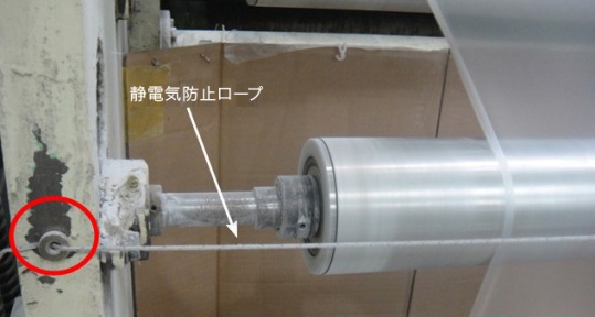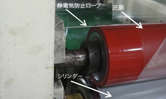 AC処理時、圧胴とシリンダーの摩擦や圧力で静電気が発生します。圧胴を端から端まで横切るように「静電気防止ロープ」を設置しました。